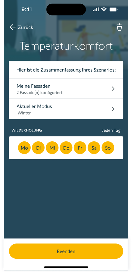 An heißen Tagen sorgen Sie mit Ihrem Smart Home für eine intelligente Klimaregulierung, noch bevor die Hitze Ihre Wohnräume erreicht. Sensoren erkennen eine hohe Sonneneinstrahlung und fahren den Sonnenschutz automatisch in die optimale Position, um Schatten zu spenden. Das hält Ihre Räume angenehm kühl und ist insbesondere dann praktisch, wenn Sie gerade nicht zu Hause sind, um Rollo, Markise oder Jalousie selbst zu steuern. Kehren Sie abends in ein kühles Zuhause zurück und schonen gleichzeitig Ihr Budget. Denn durch die smarte Vernetzung können Sie bis zu 70 %* beim Einsatz von Klimaanlagen sparen.