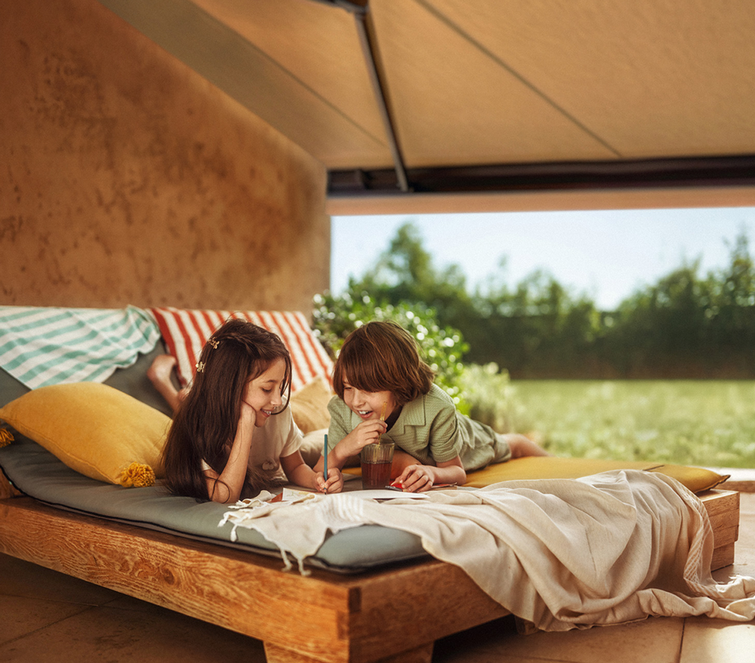 Mit den vernetzten Lösungen von Somfy genießen Sie Ihre Außenbereiche mühelos in vollen Zügen. Ihre mit den entsprechenden Sensoren ausgerüstete Markise passt sich automatisch den Wetterbedingungen an, bietet Ihrer Familie Hitzeschutz und zieht sich bei Sturm ein. Für laue Sommerabende erstellen Sie in der TaHoma-App Szenarien, um Ihre Pergola, Beleuchtung und Musik zu steuern – für unvergessliche Abende mit Freunden.